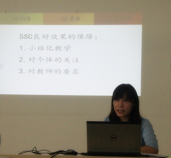 接下来,周主任连用两个讲座,分别为我们呈现了她任教南外仙林英语学科的教学实践,也明确了对我们工作的要求。周主任在讲解南外“SSC”英语教学模式时,用自制视频、自唱歌曲、现身说法等一系列形式,生动再现了南外的英语课堂,让我们受益匪浅的同时,也坚定了打出南外青奥村小学英语品牌的信心。