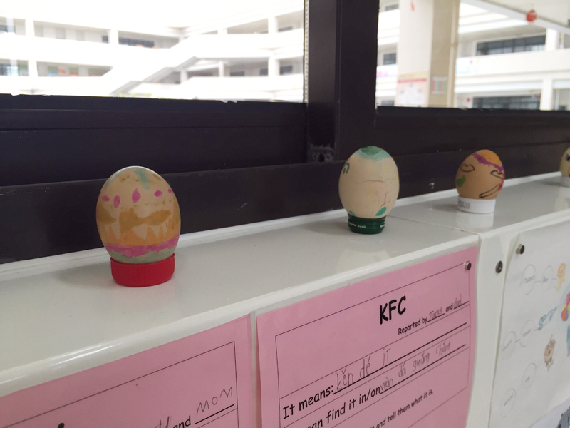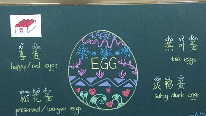青奥英语时间里,英语老师们利用移动黑板、实物图片及思维导图,向小朋友们介绍了“复活节蛋”以及中国自古传承下来的“中国蛋”的英文表达,比如tea egg茶叶蛋等等。