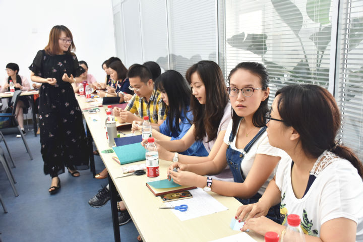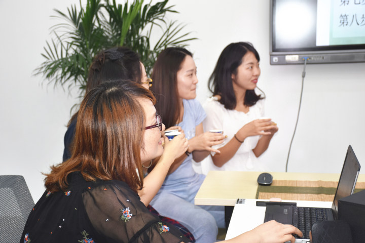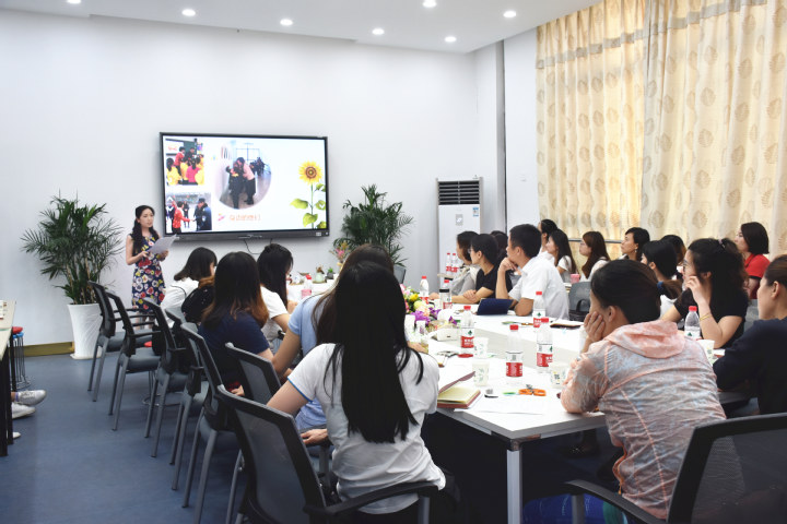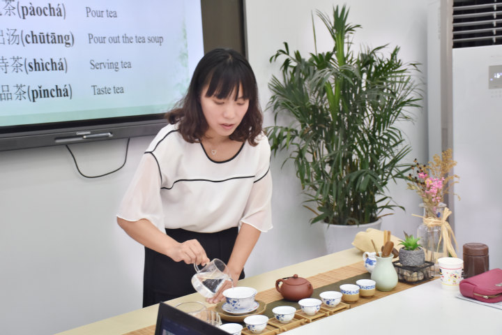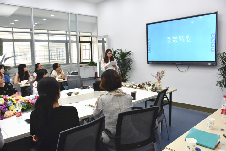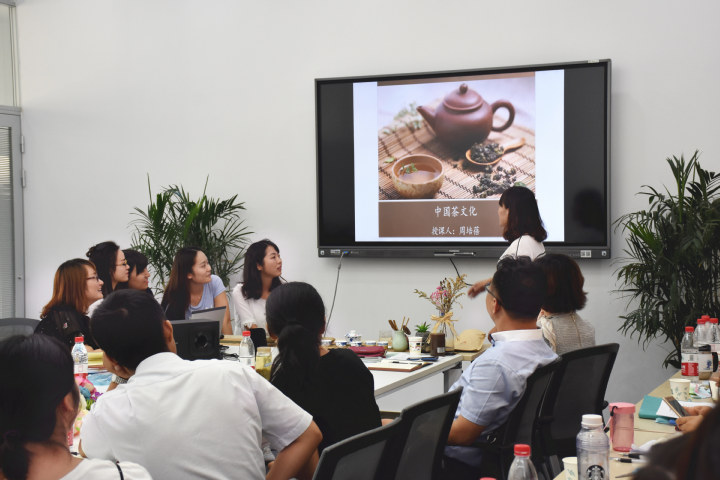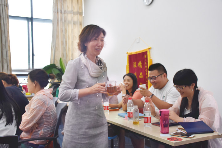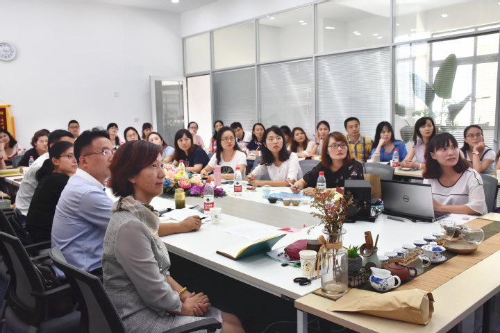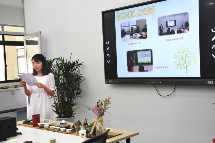 随后,周培蓓主任带来了她的学习报告。周主任暑期参加了江苏省2017年汉语国际推广的师资培训。她是南京市4名教师代表之一,在培训考核中获得了论文一等奖、课例展示三等奖的喜人成绩。周主任现场向大家展示了在培训中“最受外国人喜爱的中国茶课堂”,让大家陷入对中国文化慢哲学的沉思。