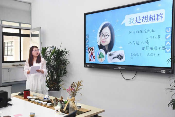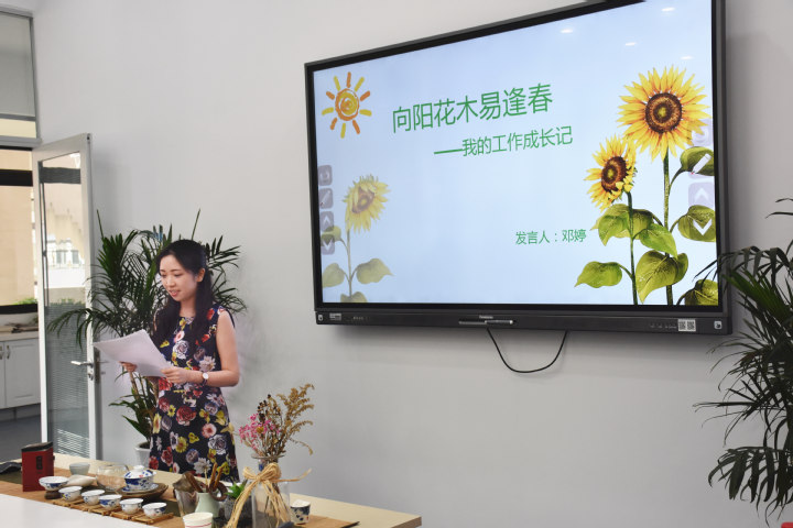 这之后,是三位优秀教师代表的成果分享。刚刚走上工作岗位就飞速成长的张雅洁老师,分享了她一年中获得的区级各类优秀奖项。在2016级187名新教师中仅有5%的新教师在三项比赛中均获奖,她就是其中之一,她说这些是努力学习和团队协作的结果。温暖的邓婷老师,告诉大家“功在平时”,个人成长不仅需追求“以理教之、以趣促之、以情感之、以艺服之”的教育境界,还要保持线上学习,与时俱进,亲近母语,努力践行大语文教学观。已有五年教龄的胡超群老师,将自己前四年的工作用等式“4=1”来概括,来南外青奥村小学一年的时间,不断地学习,不断地充实自己,向着 “通过艺术的教育”的教育理想迈进,收获良多,用她的话说就是“1﹥4”。