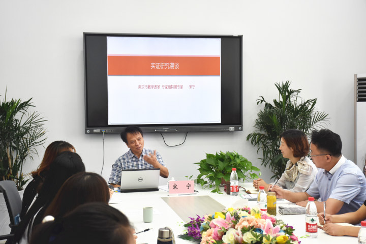 原南京市教科所所长、南京市教学改革专家组特聘专家宋宁先生以漫谈的形式和大家分享交流了“实证研究”这个话题,他强调实证研究即是基于事实和数据的研究。宋所结合当前的教育研究的形势,他从三个方面,即:实证研究是什么?为什么要进行实证研究?怎么研怎么究等问题和大家进行了交流,不仅从理论上进行了全面的阐述,还结合相关的实证研究的样例和大家进行分享,在场的老师们屏气凝神,认真倾听,收获颇多。