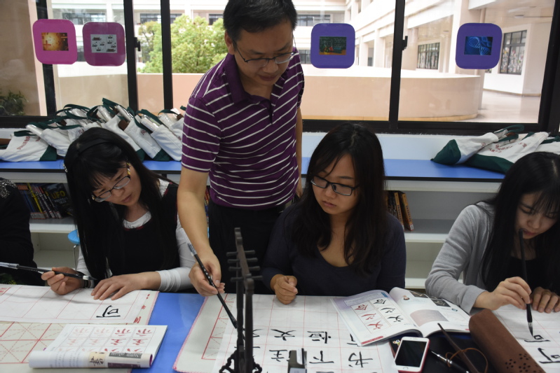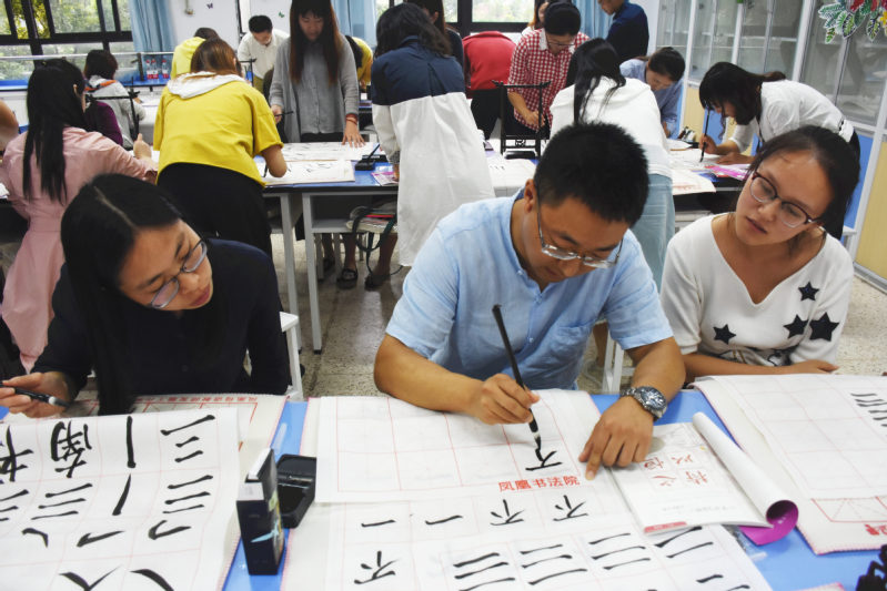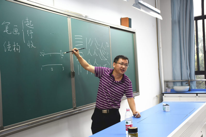 致辞后,徐道忠和汪峣两位老师为大家上了第一堂书法课。徐老师从正确的握笔姿势开始,对汉字的基本笔画及注意点进行了深入浅出地讲解和示范。老师们兴趣盎然,跃跃欲试。之后的书写练习时间里,教室里时而寂静无声,时而传来啧啧赞叹声,时而听到窃窃私语的切磋探讨声……每位老师都沉浸在四溢的墨香之中。徐老师和汪老师走到老师们中间,进行个别指导,帮助老师们分析书写中存在的问题和改进的方向,让大家受益匪浅。