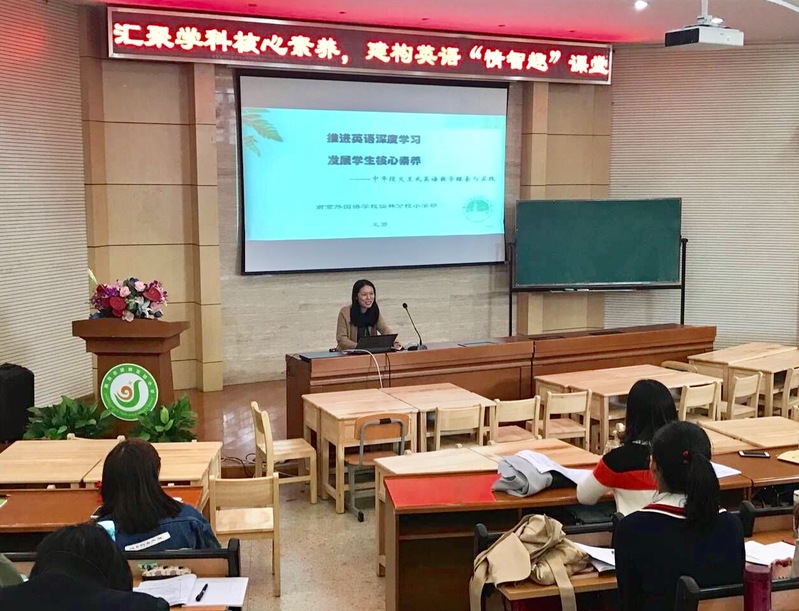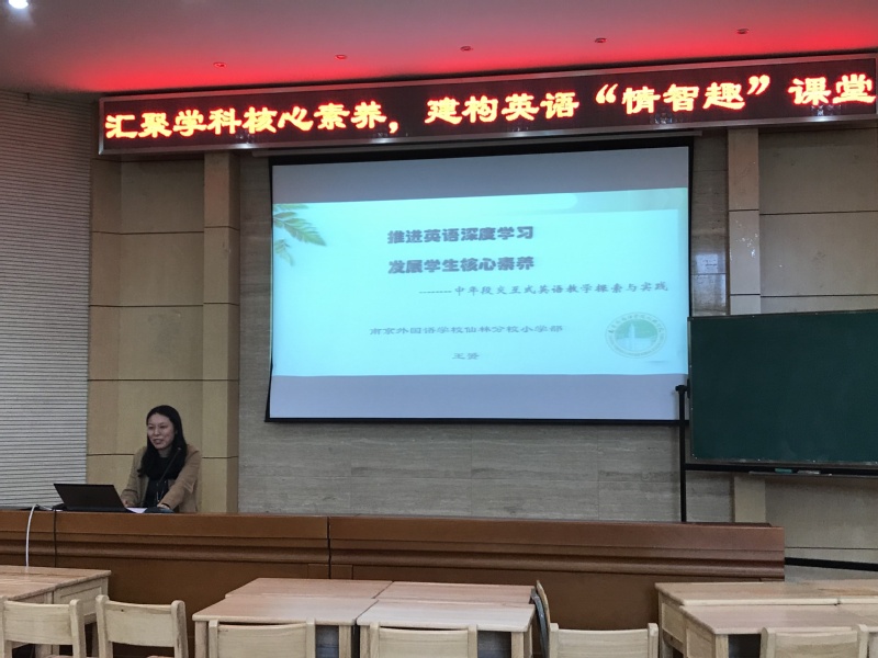 三节课后周培蓓老师带领盟区内全体教师对核心素养和英语学科核心素养进行了重温和解读。随后,来自仙林分校的教学专家王赟老师给大家带来《推进英语深度学习,发展学生核心素养》的专题讲座,王老师分享了她在南外仙林分校14年低中年段英语教学的丰富经验以及在各年段关注学生英语学科素养(语言能力、文化品格、思维品质、学习能力)的具体细致的实施路径,让所有老师们受益匪浅。