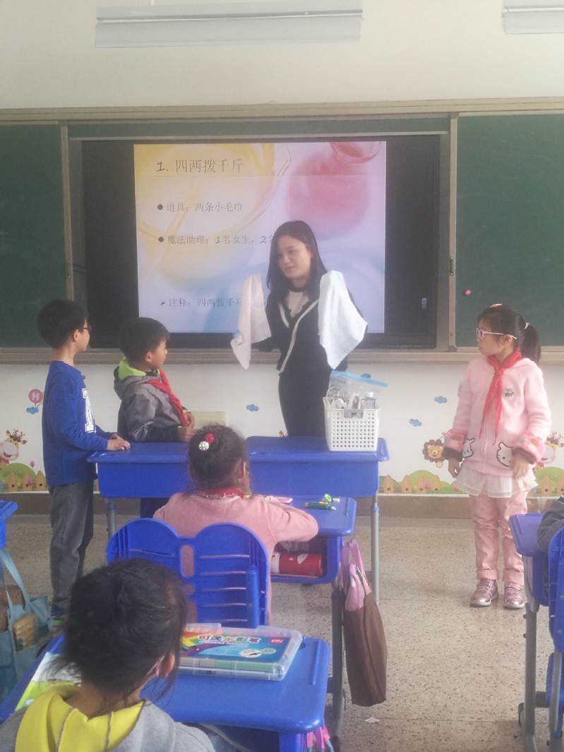 二(3)班周峻宇妈妈给孩子们带来了一堂别开生面的一课——《神奇的魔法》通过实验让孩子发现许多科学的道理。课堂上请力气最小的同学捏住两条毛巾的交叉处,两个力气最大的同学来拉开,可是怎么也拉不开,所有小朋友都惊叹不已!课上还教了孩子做爱心环,制作指南针……下课零响了,孩子们还意犹未尽,不时围在“阿姨老师”面前说自己的收获及想问的问题,真是一节“神奇”的课。