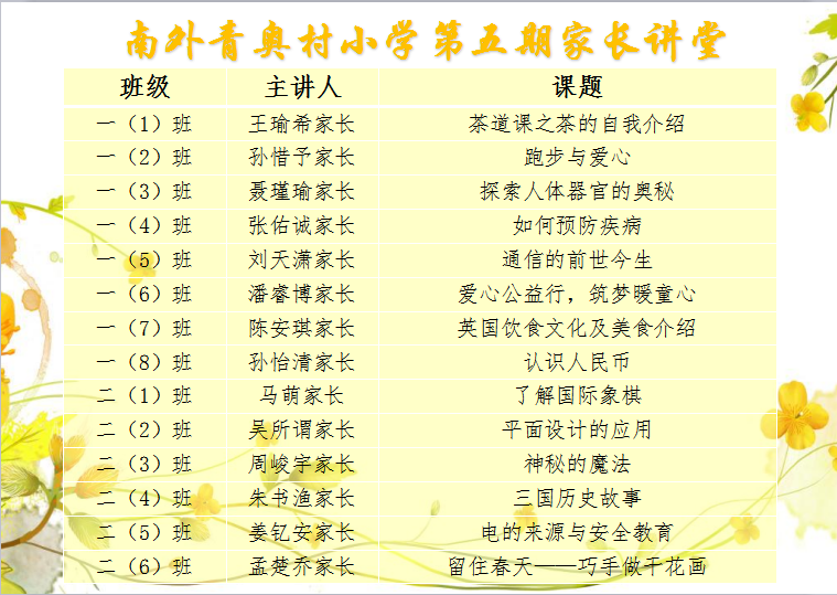 4月25日下午,我校第五期“家长讲堂”在全体师生的期待中如约开讲。本期的主讲嘉宾们带领孩子们了解茶道、认识人民币、制作干花画、下国际象棋、感受异国文化等等,课程丰富多彩、别致而有趣,孩子们度过了一个美好的下午,旁听的老师们也获益匪浅。我们一起去瞧一瞧吧!