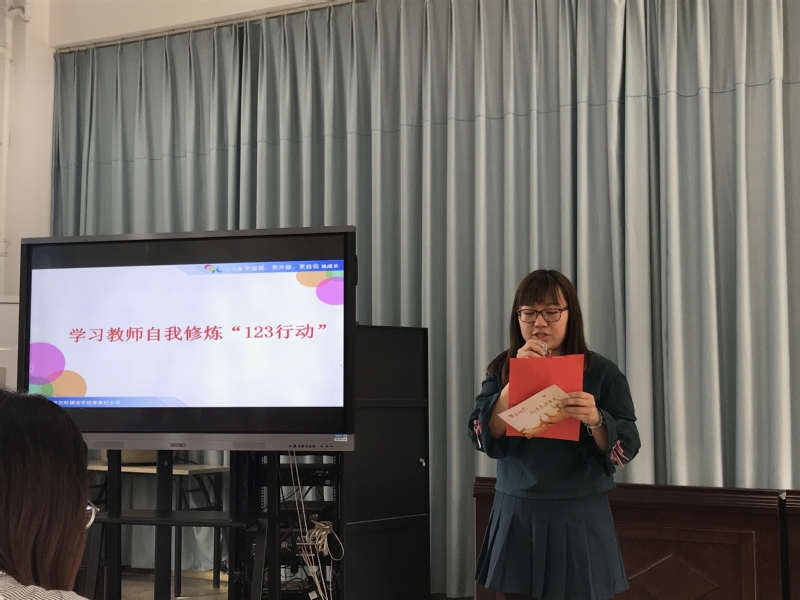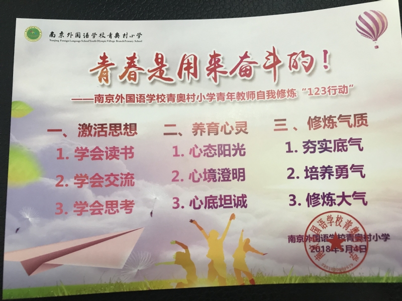 随后,在团支委任经纬老师的带领下,全体老师共同宣誓南京外国语学校青奥村小学青年教师自我修炼“123行动”准则——激活思想、养育心灵、修炼气质。