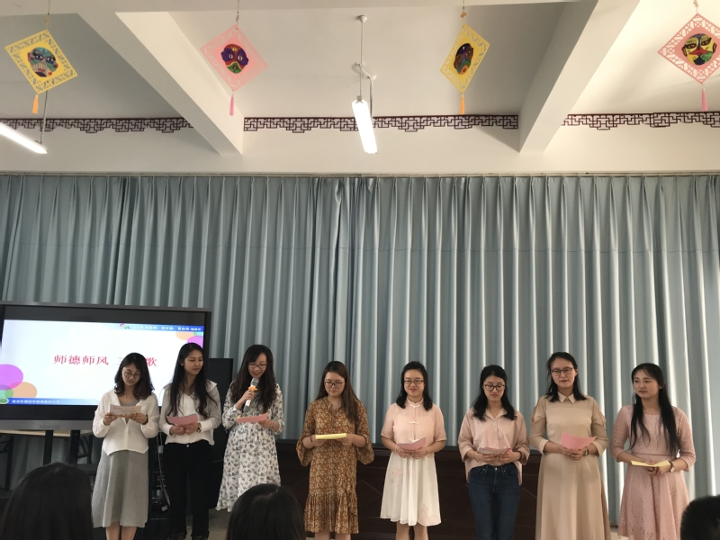 为人师,德为先。赵蕾、刘咏仪等8位团员老师为大家朗诵《师德师风三字歌》,字字铿锵有力,庄重又不失活力,赢得了全体老师的赞叹。