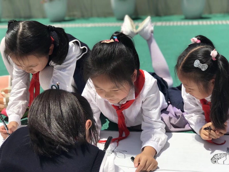 瞧,小朋友轻声商议,略皱眉头,小笔轻落,海底世界、森林公园、动画城堡……一条条柔和流畅的线条、一抹抹鲜明活泼的色彩,构成了一条精彩动人的长卷。孩子们在欢声笑语中完成了长卷绘制。