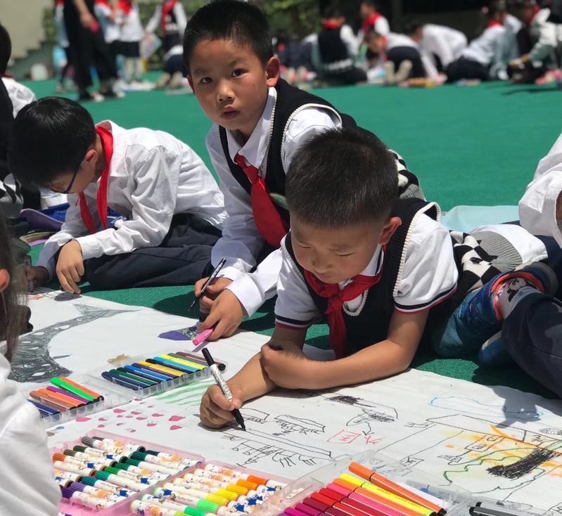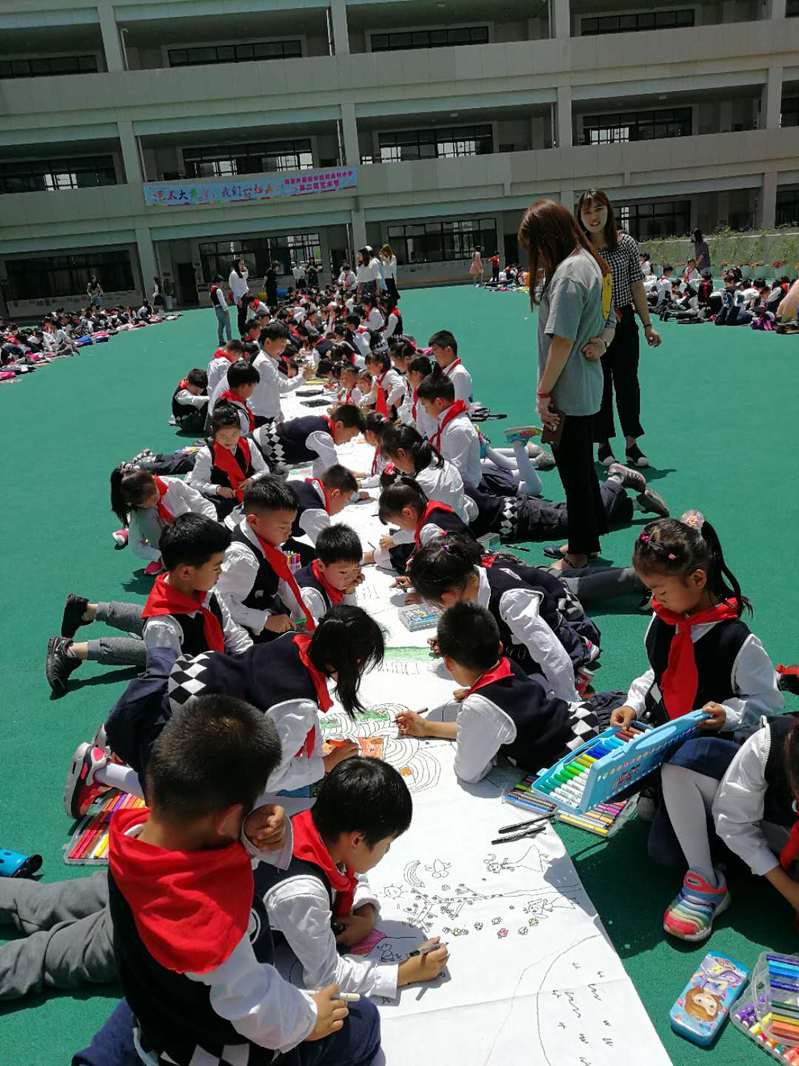 本周三中午,我校举办了“童心共绘七彩卷”的大型百米长幅绘画活动,艺术组组长胡超群老师主持了本次活动。孩子们组成小组,围绕班级设定的主题,自由作画,现场气氛热烈。
