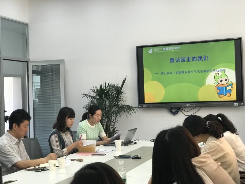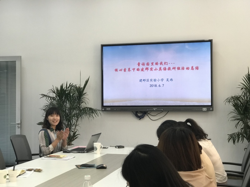 首先,吴玮老师以《童话园里的我们——核心素养下的建邺实小英语教研组活动总结》为题,介绍了建邺实小实英语组情智趣课堂研究的具体情况。他们虽然人数少,任务重,但老师们团结一心,携手共进,一年级来在构建英语“情智趣”课堂的实践中取得了很大的成果。这些成就不仅源于英语组扎实有效常规工作,落实到人的管理制度,更是源于他们在学科建设发展方面大胆地实践与尝试。