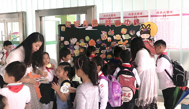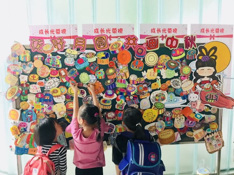 9月21日清晨,南外青奥村小学的门口可是热闹非凡。一入校,同学们兴高采烈得将自己绘制的月饼图片粘贴在大黑板上,瞅瞅我的月饼,再看看你的,欢乐的气氛弥漫整个校园。