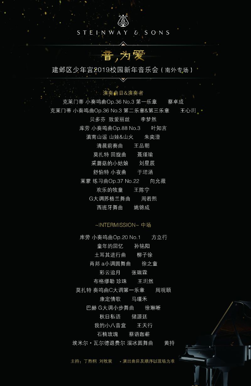 12月31日下午, “音,为爱——2019施坦威校园音乐会(南外专场)”在建邺区少年宫施坦威音乐厅隆重举行。