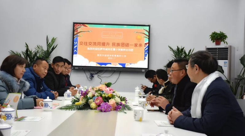 各民族交往交流交融是中华民族形成、发展和繁荣的内在动力。为进一步促进民族团结,增强爱国主义情感,提高业务水平,拉萨市城关区雪小学教师访问团于1月7日前来我校交流,河西外国语学校的戚校长也陪同前来。我校蒋丽云校长和艺术组的老师们热情地接待了这些来自“阳光之城”的客人。