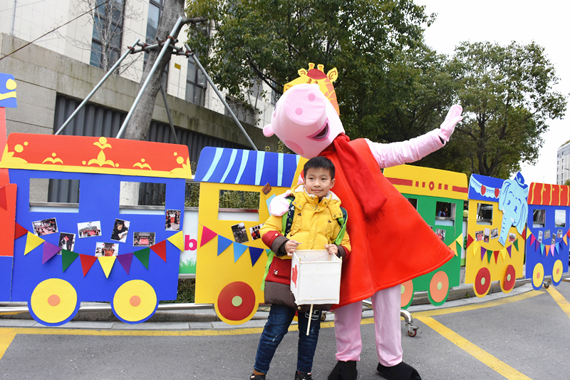 报到当天,校长们、老师们戴红围巾在校门口给安全返校的同学们发守纪福。哇,驶向新学期的小火车上有我们寒假生活的照片,现场还有我们最爱的佩琪和乔治呢。