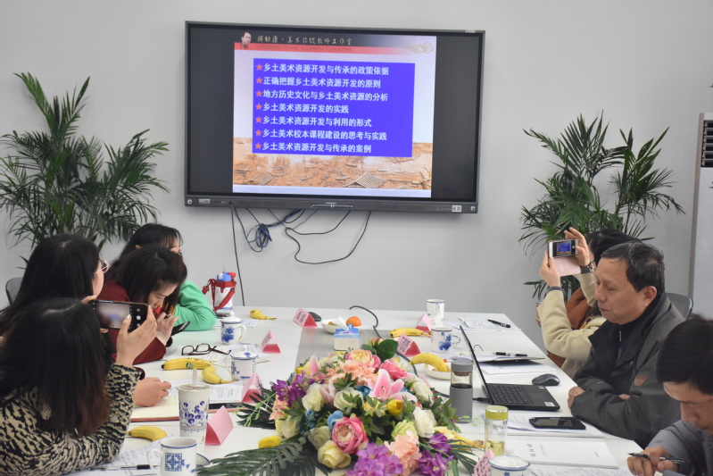 傅特给老师们带来了满满的“干货”——《乡土美术资源开发与美术校本课程》讲座,傅特从国家教情的大背景出发,顺应新课改,结合《美术新课程标准》,给老师们讲授如何将地方美术资源开发、利用并传承其意义与价值,从而形成各自的校本课程,老师们听得兴致盎然、深受启发。