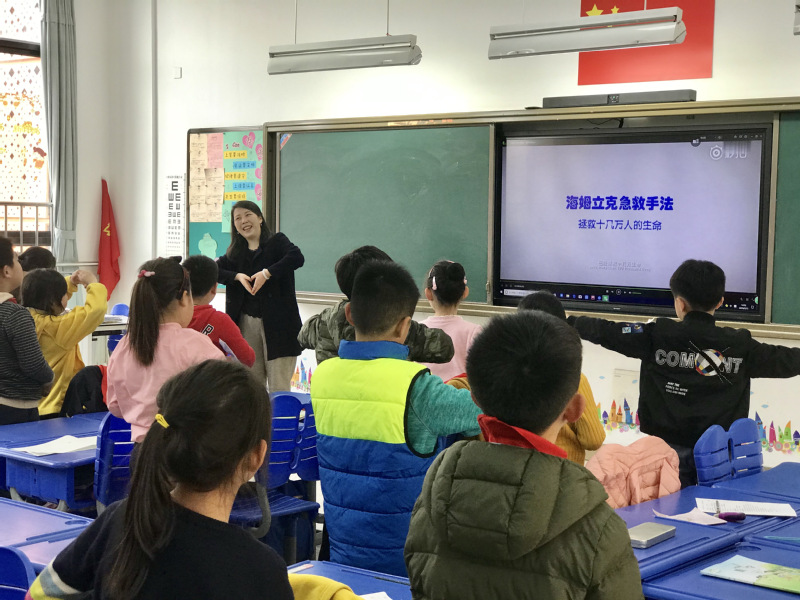二(8)班的卞奕新妈妈先播放了一段生动有趣的视频,向孩子们介绍了“海姆立克急救法”。接着用一个具体案例让孩子们了解了什么是气道异物堵塞,如果自己或身边人发生气道异物堵塞应如何救助,平时生活中如何预防此类问题等。卞妈妈用简单易懂、动静结合的方式向孩子们普及了实用的医学知识,防止意外的发生,让孩子们受益良多。