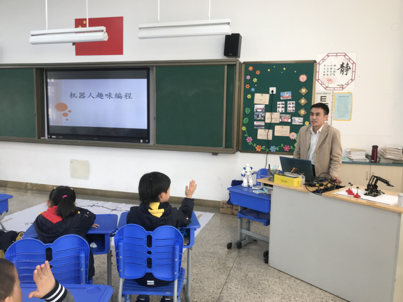 二1班的刘保逸爸爸给我们带来的一节《机器人趣味编程》。整节课,刘爸爸边讲解边操作,一步一步教孩子们怎样编程。孩子们明白了机器人为什么前进、转眼、停下,原来哦都是编程的功劳。生动的讲解,加上趣味的机器人展示,让孩子们沉醉其中,听得异常认真,并积极参与到互动中去,亲自给机器人车子编写程序。这样的课程孩子们非常感兴趣,纷纷表示回家也要探究机器人的奥秘啦。