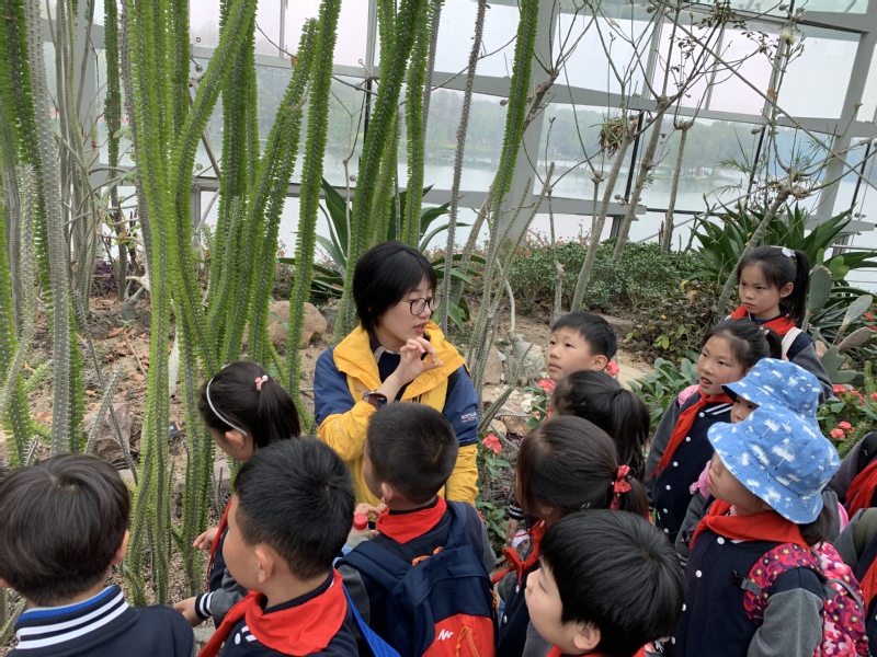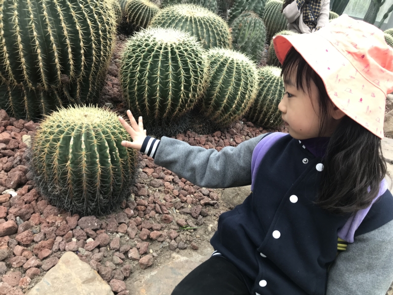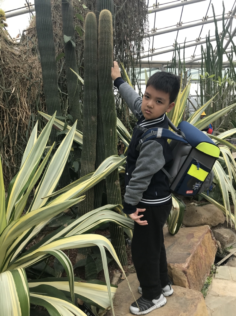 穿过郁金香花海,便来到了热带植物区。一阵阵热浪迎面而来,空中弥漫着湿湿的水气,仿佛来到了一片热带雨林之中。一走进多肉植物区,“我第一次见到这么大的多肉植物”,孩子们自发伸出小手和多肉植物比大小,还有的孩子和多肉植物比身高,奇趣的动作让人忍俊不禁。