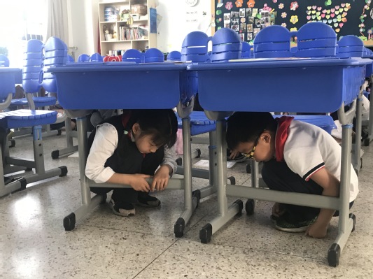 随着一声急促的防震警报声响起,全体学生以最快的速度用书本护着自己的头部躲到课桌下,老师也快速在教室墙角蹲下。紧接着,第二次警报响起,全体学生在教育小组老师的引导下,按照学校安全逃生的规定路线“安静、有序、快速、稳步”地撤离到学校操场。教室、走廊、楼道、操场,每一处都有安全引导的老师在现场指引。全体师生撤离到操场后,各班学生迅速排成四路纵队,老师们也迅速清点人数上报。