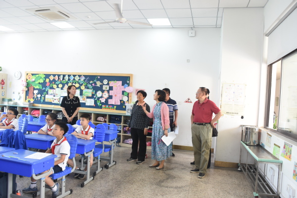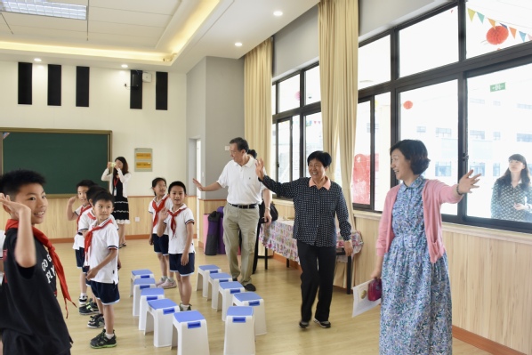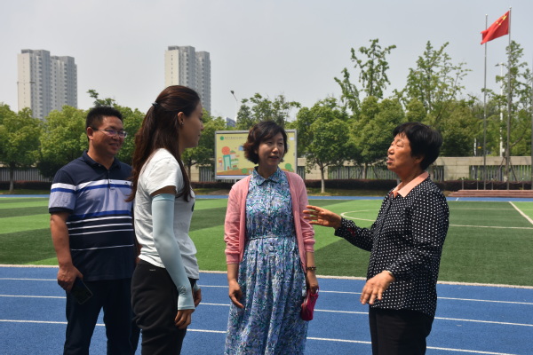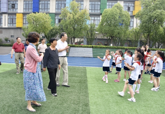 张主席一行查看了体育馆、小剧场、图书馆、教学楼等校容校貌,称赞了学校兼具现代化人文性的办学环境。张主席在运动场上观看了全校学生阳光大课间体育游戏锻炼活动,她还走进了一个又一个课堂,观察了解学生的学习情景,走进办公室,与老师们亲切交谈。