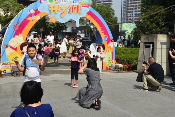校门口,小萌娃们一下子就被美丽的彩虹门和精美的手卡吸引住了,纷纷请爸爸妈妈用照片记录下了珍贵的第一次进校。