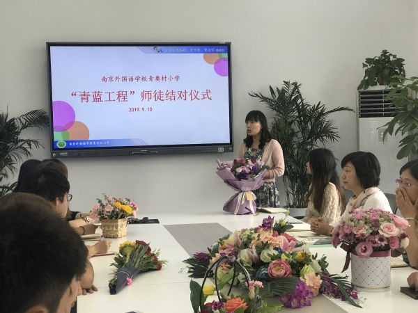 周培蓓副校长主持了本次活动,她介绍道,南外青奥村小学自办学以来就坚持为刚走向教育教学岗位或新加盟的教师配备经验丰富的骨干教师作为师父,实行一对一的帮扶和指导,帮助他们适应新环境,熟悉新岗位,了解新理念,胜任新业务。