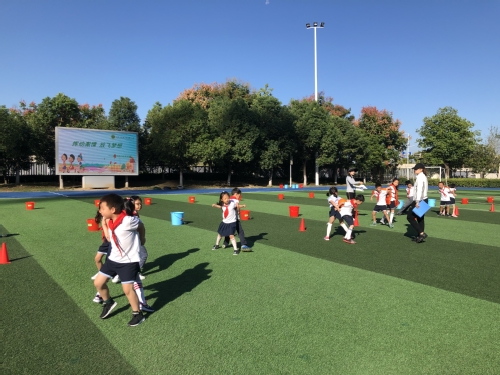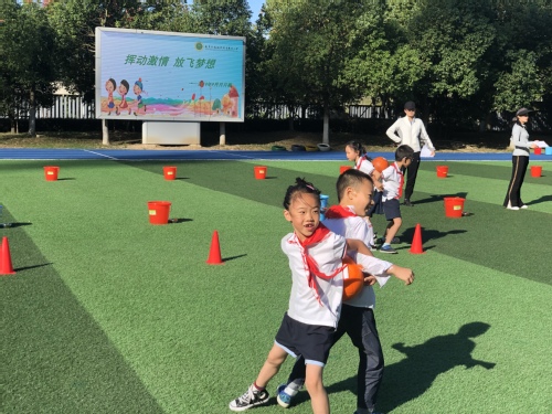 首先进行的是“炮弹运输大比拼”。孩子们两两一组,手拉手、背对背将球夹起,快速运输。只见他们为了夹住球,或将整个背部绷紧;或想办法将两个人“锁”在一起;或肘部微微向里收好护球……先后到达终点的同学及其队伍爆发出阵阵欢呼,而一旁的加油声、呐喊声更是不绝于耳。