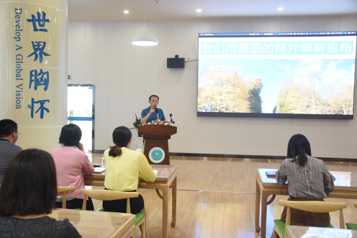 讲座以一组德国幼儿园的照片开启,照片里有孩子们创作的“涂鸦一角”、“自制指路牌”,有学校设施设计的“有上下游的趣味水池”、“有轮子的一半桌腿”,有教师课程开发的“落叶与美术课”、“头像与表现”的结合……宋科长从装备的选择、儿童的视角、空间的共享等多个维度解读这些设计蕴含的教育价值。