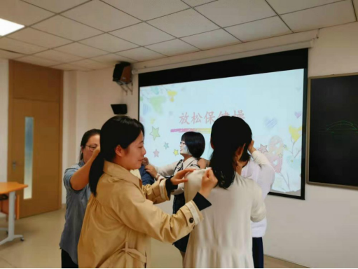 她运用自己的专业知识,首先通过两个热身游戏“放松保健操”和“想象接力”让原本有点陌生的老师们在短时间内熟悉起来,拉近了大家的距离。