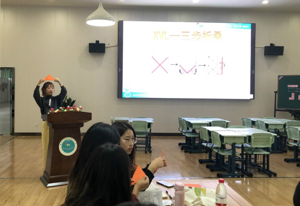 随后,二年级的窦亚苒老师结合两节课,从传统桌游、现代桌游和桌游改编三个方面,将我校短短一学期来,在数学课堂中尝试运用桌游进行教学的初步思考和实践探索情况向在场专家、老师们进行了汇报,并现场让大家体验了《巧板折一折》和《分数一家亲》两个小桌游的乐趣。