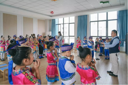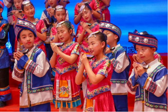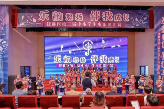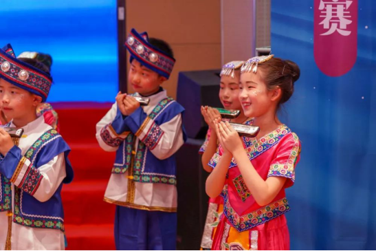 瞧!台上的小乐手们身着艳丽的服装,个个精神饱满,意气风发,他们手持闪亮的口琴,技巧娴熟,为现场评委和观众们演奏了一曲深情而优美的《国家》。