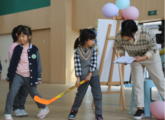 体育老师们设计的“冰上曲棍球”项目,让孩子们模仿冬奥会冰上曲棍球项目的动作,通过绕过障碍物,将球击打进球框,既锻炼了孩子们的身体协调能力,又考验了孩子们的反应力。