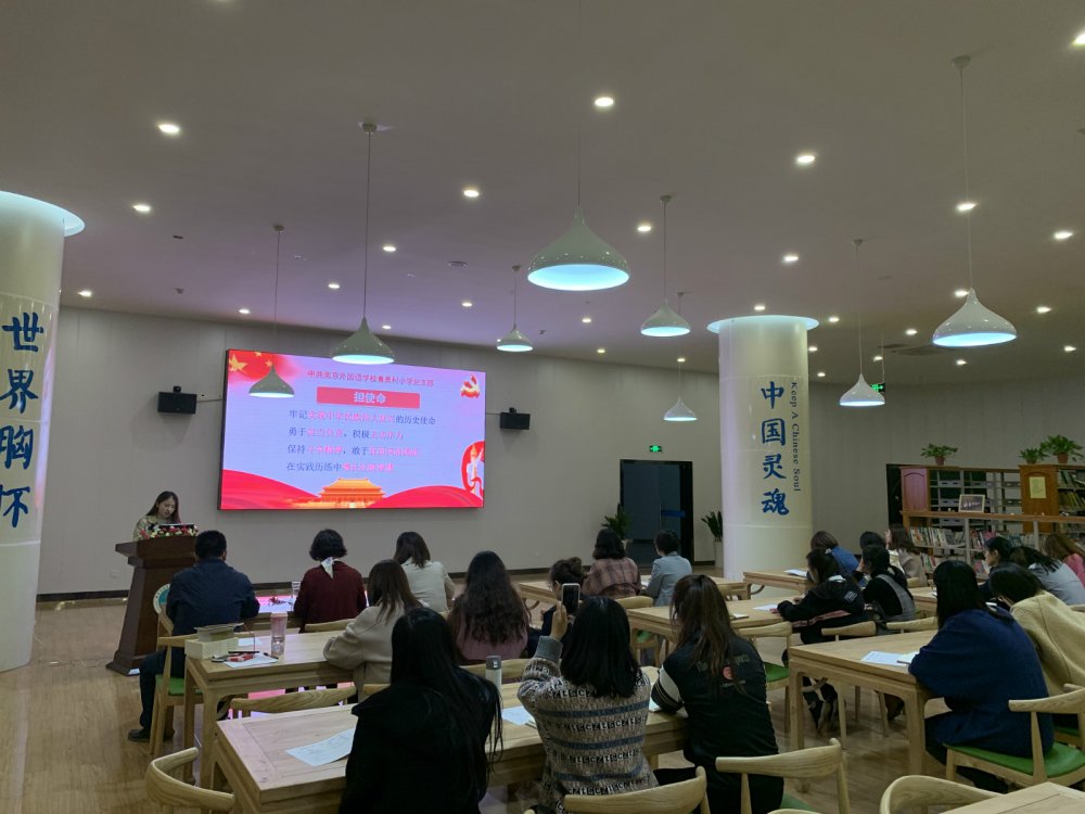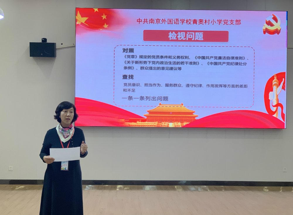 11月5日下午,南京外国语学校青奥村小学全体党员教师齐聚图书馆,一同学习“不忘初心、牢记使命”主题教育专题党课。本次会议主题为“守初心、担使命,找差距、抓落实”,由蒋丽云书记主持,全体党员佩戴党徽参加。