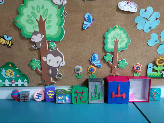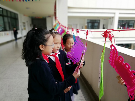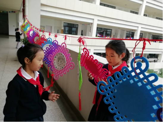 中国结是中国特有的手工编织工艺品,三年级的小朋友们将汉字演变在纸碟上绘制、装饰,图文并茂,煞是好看,与五颜六色的中国结相得益彰。白色的纸碟,多样的汉字演变,合理地配图,粘贴在各色的中国结上!中国结颜色各异,有亮眼的绿色,有嫩嫩的粉色,有明亮的柠檬黄,有沉静的天蓝,它们下面都挂着火红的流苏,在风中婀娜摇曳,成了校园里一道别样的风景!