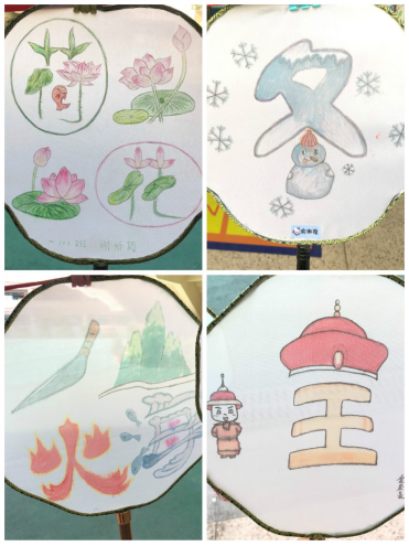 一年级的孩子们在轻巧的小团扇上画出了自己最喜欢的汉字,落雪的“冬”、绽放的“荷”、威风凛凛的“王” ……一把把精心设计的团扇高高挂起,成为走廊里一道亮丽的风景线。课间,孩子们迫不及待地向好朋友们介绍自己最爱的汉字,走廊上洋溢着浓浓的“节味儿”!