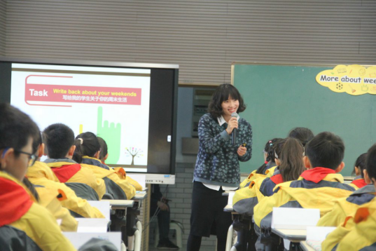 活动中,来自四所学校的名师向全市小学英语教师进行了精彩展示。其中,我校周培蓓副校长将译林五年级Unit7 At weekends 与课外绘本阅读《Luke's blue box》相关内容巧妙融合,为大家带来了一堂生动的读写教学展示课。周校长巧用我校四年级五班学生一张张介绍周末生活为内容的卡片,向金中实小五年级四班学生传授了写作技巧,并布置了写回信的任务,将课堂与生活串联。有趣的“Hamburger Writing Method(汉堡写作法)” 将写作任务化难为易、深入浅出,让学生轻松习得了技巧,突破了难点。在她的引导下,孩子们忽然发现一直令自己头疼的英文写作原来可以如此有趣!他们认真思考、积极参与,不一会儿就当堂创作出独具特色的“大作”。