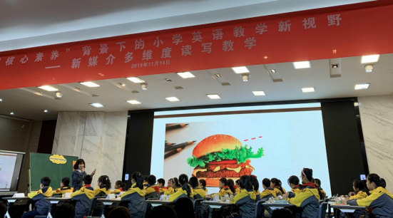 活动中,来自四所学校的名师向全市小学英语教师进行了精彩展示。其中,我校周培蓓副校长将译林五年级Unit7 At weekends 与课外绘本阅读《Luke's blue box》相关内容巧妙融合,为大家带来了一堂生动的读写教学展示课。周校长巧用我校四年级五班学生一张张介绍周末生活为内容的卡片,向金中实小五年级四班学生传授了写作技巧,并布置了写回信的任务,将课堂与生活串联。有趣的“Hamburger Writing Method(汉堡写作法)” 将写作任务化难为易、深入浅出,让学生轻松习得了技巧,突破了难点。在她的引导下,孩子们忽然发现一直令自己头疼的英文写作原来可以如此有趣!他们认真思考、积极参与,不一会儿就当堂创作出独具特色的“大作”。