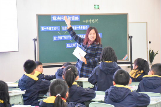 魏特为三(2)班同学执教了《解决问题的策略——从条件想起》一课。这是学生第一次接触解决问题的策略,为了让孩子们深刻体验这一策略的思维方法,魏特把例题和练习题进行了重组。在例题后,精心设计出结构相仿的4道题,让学生在题组中进一步感受“从条件想起”的策略分析方法。