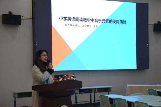 三节精彩纷呈的课结束后,来自南外仙林分校的王露主任对本次活动进行点评。王老师简明扼要却又一针见血的点评将老师们对课堂的理解推向深处。随后,她还带来了《小学英语阅读教学中音乐元素的使用策略》的精彩讲座,别出心裁的课堂关注角度与教学策略解析让在场老师获益匪浅。