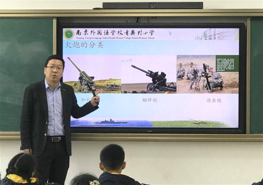 三(4)班翟宇则爸爸通过生动的讲述,让孩子们“初识火炮”。翟宇则爸爸从孩子们熟知的中国古代四大发明之一——火药引入,并结合图片详细介绍了战争之神火炮,通过讲解火炮的起源、分类以及工作原理,生动地向孩子们展示了武器的魅力,孩子们听得津津有味。翟爸还和孩子们积极互动,孩子们也踊跃提问,并励志为中华之崛起而更加努力读书!