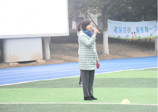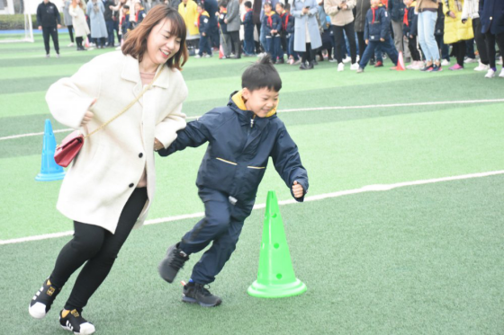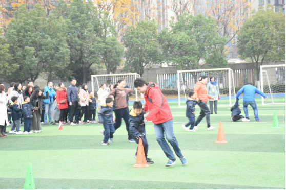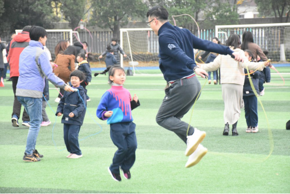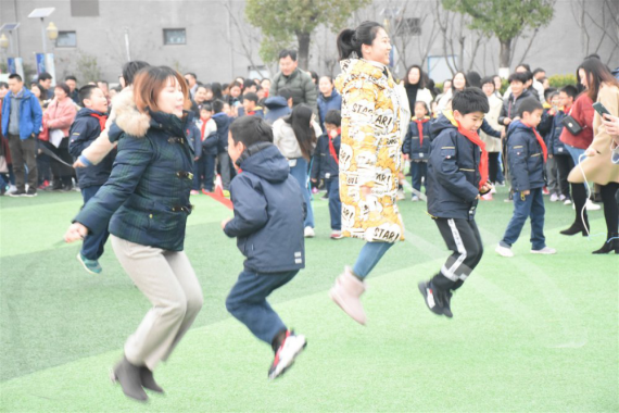 音乐声响起,爸爸妈妈们跟随孩子们一起走进体育场。“大手牵小手,小脚穿大鞋”和“我的跳绳一起跳”两个有趣的亲子游戏让每一位家长和每一个孩子乐在其中,不仅培养了孩子们的合作意识,更增进了家长与孩子间的默契程度。游戏结束后,蒋校长就游戏活动和家长们进行了交流。她说,小脚穿大鞋——难受,大脚穿小鞋——对不上号,合作跳绳怎样才能跳得更一致?今天,这样的亲身体验一定能给家长们在家庭教育上许多启示……引发了家长们的思考。