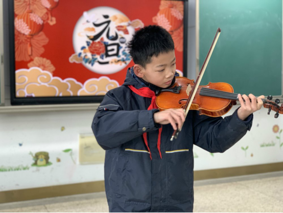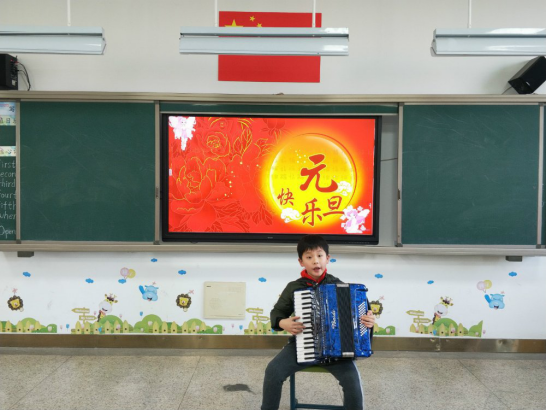 各班级自主开展元旦庆祝活动。瞧!孩子们一个个自信满满地走上舞台,有的唱歌,有的跳舞,有的说相声,有的演奏乐器,还有的表演花样足球……台下的同学看得目不转睛,津津有味,情不自禁地为表演的同学送去热烈的掌声,场面热闹温馨。