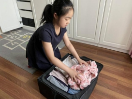 瞧,收纳小能手们把衣服平铺在床上,妥帖地叠好,一件一件放进自己的小衣橱;把书本一本一本脊背朝外,整整齐齐地立在自己的小书架上;把被子平平展展地拉开,两边折向中间,再从两头向中间折,最后对折,哇,被子成了小小豆腐块!