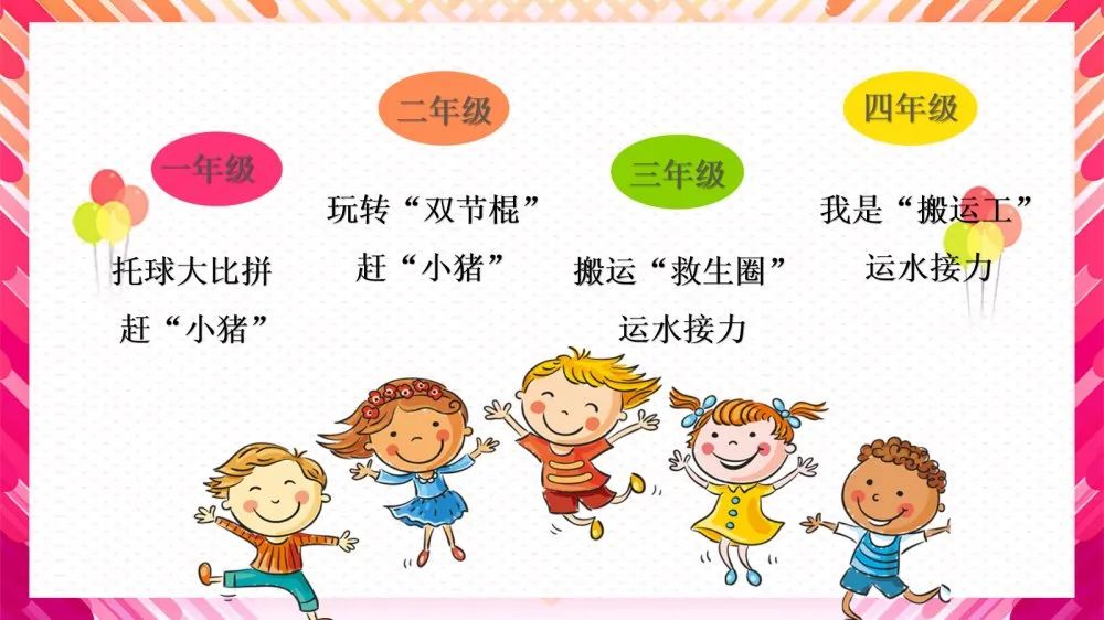 根据年级的不同,体育组老师们设置了适合各年龄阶段的趣味活动项目。