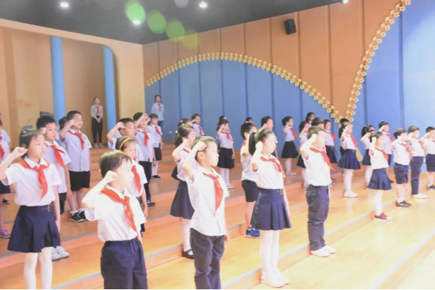最后,全体少先队员在大队辅导员张老师的带领下举起右拳庄严呼号:“准备着,为共产主义事业而奋斗!”孩子们群情激昂,大声呼应:“时刻准备着!”