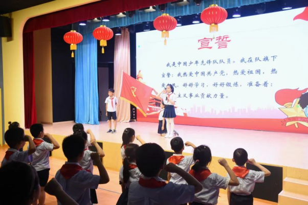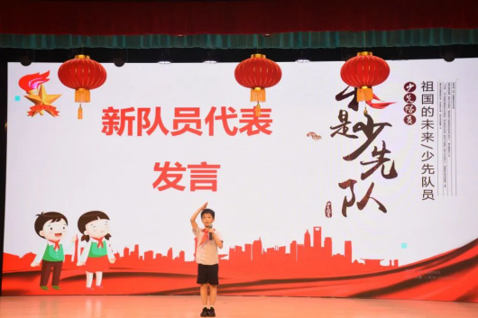 新队员代表梁嘉宸同学用稚嫩而有力的声音向老师和同学们表达了坚定的决心:要用实际行动为胸前的红领巾增光,为少先队添彩。