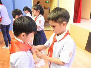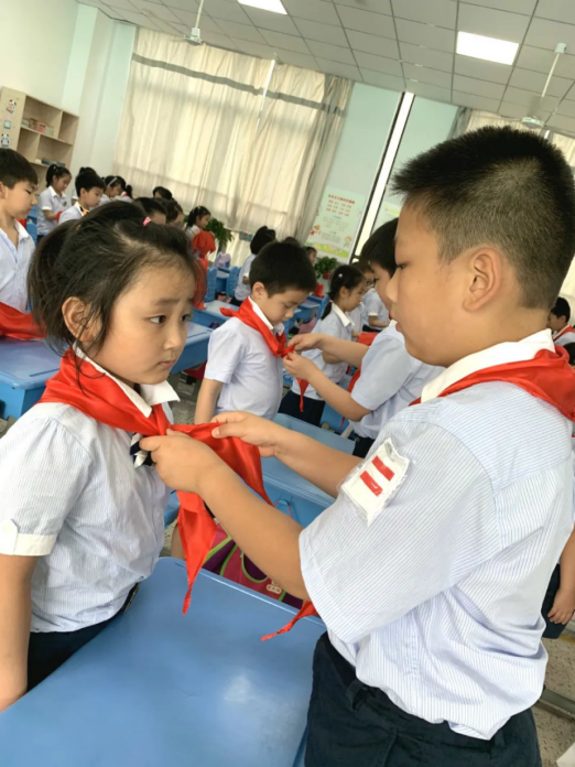 三年级的老队员、辅导员老师们和学校少工委成员为新队员佩戴上了鲜艳的红领巾。