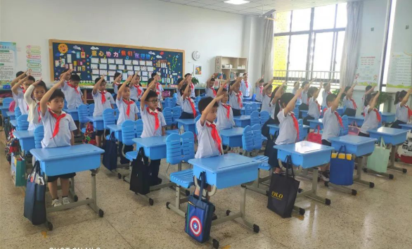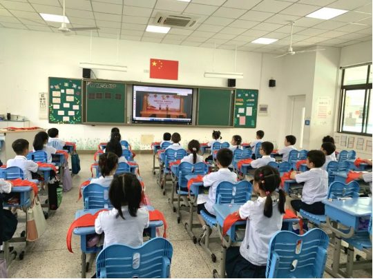 由于疫情的影响,此次入队仪式设置了主会场和分会场,一年级每班5名学生代表在小剧场(主会场)参加活动,各班同学们在教室(分会场)收看现场直播。