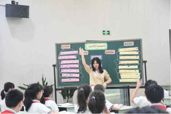 孔老师的课以孩子们参与“云上外语节”的活动视频片段作为导入,运用内容丰富、形式多样的游戏活动充分调动了孩子们的学习兴趣、参与热情,让孩子们在动中练、在乐中学。冯老师的课上通过多重任务的设置,引导孩子们归纳总结文章结构,并尝试用“汉堡包写作法”描绘自己最爱的季节,引导学生“智慧地学”。