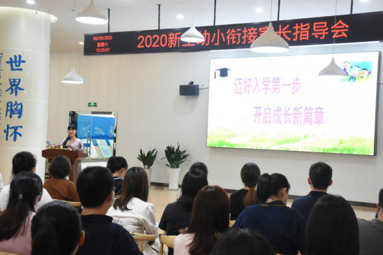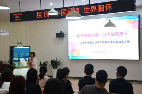 在学生入校前,我们一年级新生的宝爸、宝妈们也提前学习,8月29日下午,我校召开了2020届一年级新生家长会。极具亲和力的蒋校长以朋友的身份和家长们拉近了距离,此次讲话紧紧围绕着学校的办学愿景、教学理念、课程设置等多方面内容展开分享。其中着重向新生家长介绍了南外学子的四种核心素养,即是信息修养、自主学习力、现代人格、社会行动力。同时蒋校长温和而有力的谈话赢得了家长们的阵阵掌声。